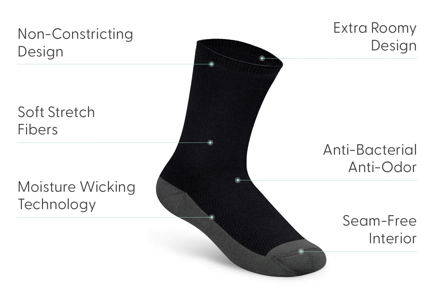 BioSoftTM Charcoal Extra Roomy Non Binding socks for women and men by Orthofeet feature non-constrictive, wide, seam-free design, excellent moisture wicking system, and soft, cushioning interior with extra padding that offer unsurpassed comfort and protection for sensitive feet and for persons with circulatory problems and edema. Sold in a package of 3 pairs.