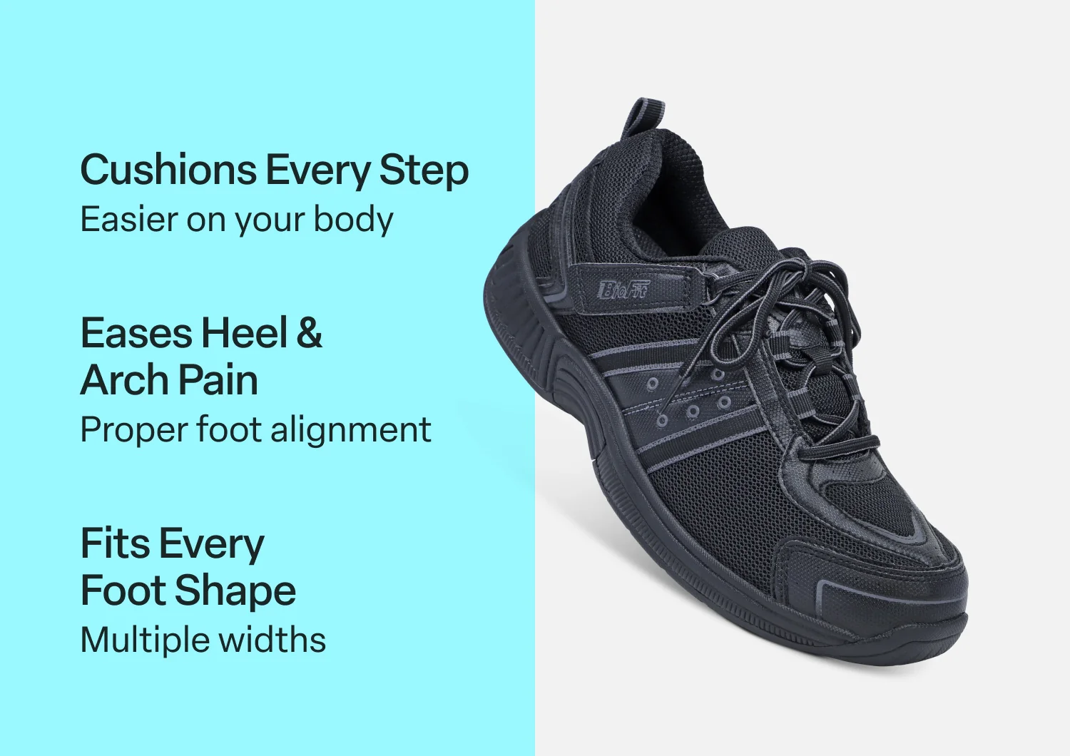 All roads lead to comfort in this breathable and non-binding microfiber and fabric sneaker. Our tie-less lacing system is just as cool & tie these once, then use the tabs on either side to open and close them. Brilliant! Enjoy every street, lane and path with the adjustable support of the Ortho-Cushion™ System. The mild rocker sole and padded interior make getting there pain-free.
